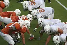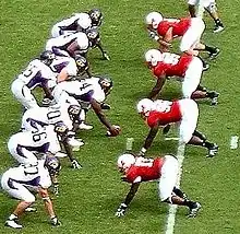 Defensive linemen will often take a stance with one or both of their hands on the ground before the ball is snapped. These are known as a "three-point stance" and "four-point stance" respectively, and this helps distinguish a defensive lineman from a linebacker, who begins in a two-point stance (i.e. without a hand touching the ground).