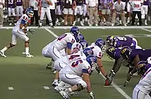 In American football, the offense is the term used to describe the team that has possession of the ball and is advancing toward the opponent's end zone to score points. The eleven players of the offense can be separated into two main groups: the five offensive linemen, whose primary job is to block opponents and protect their quarterback, and the six backs and receivers, whose primary job is to move the ball down the field by either running with it or passing it.