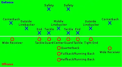 In American football, the specific role that a player takes on the field is referred to as their "position." Under the modern rules of American football, both teams are allowed 11 players on the field at one time and have "unlimited free substitutions," meaning that they may change any number of players during any "dead ball" situation.[lower-alpha 1] This has resulted in the development of three task-specific "platoons" of players within any single team: the offense (the team with possession of the ball, which is trying to score), the defense (the team trying to prevent the other team from scoring, and to take the ball from them), and the so-called 'special teams' (who play in all kicking situations). Within these three separate "platoons", various positions exist depending on the jobs that the players are doing.