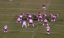 Four backs line up behind the line of scrimmage. Additionally, there are two receivers, one on each end of the line of scrimmage, who line up outside of the interior linemen. There are four main positions in this set of players: