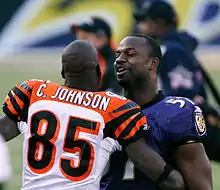 On February 4, ESPN's Chris Mortensen reported that Johnson felt betrayed by Lewis and was privately threatening to sit out the 2008 season, though his agent Drew Rosenhaus denied it.[22] When asked about trade rumors, Johnson said "Call me, Dan," referring to Redskins' owner Daniel Snyder,[23] On April 22, the Cincinnati Bengals' declined a Washington Redskins' trade for Johnson involving a first round 2008 selection and a 2009 selection.[24] and on NFL Network's NFL Total Access, Johnson said he did not want a pay raise from the Bengals, but desired a "change of scenery".[25] Lewis stated he had not spoken to Johnson since the last regular season game, and reiterated his lack of interest in a trade. After several weeks of silence, in April, Johnson again announced he wanted to be traded, and caused a rift with teammates by refusing to attend off-season workout programs and practices.[26][27][28] Nine days before the opening of the Bengals' mandatory minicamp on June 12, Johnson told ESPN The Magazine that "of course I (will be)" attending,[29] confirmed by his agent.[30] After ankle surgery on June 18, Johnson returned to full practice in August.[31] He suffered a partially torn labrum in the first preseason game on August 17, but decided to play the entire season with the injury.[32][33]