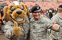 The team has had various promotional logos throughout the years, such as the "Brownie Elf" mascot or a Brown "B" in a white football. While Art Modell did away with the Brownie Elf in the mid-1960s, believing it to be too childish, its use has been revived under the current ownership. The popularity of the Dawg Pound section at First Energy Stadium has led to a brown and orange dog being used for various Browns functions. But overall, the orange, logo-less helmet continues as the primary trademark of the Cleveland Browns. The Browns have used special commemorative logos during individual seasons, such as the 1999 logo to celebrate the team's return to the NFL, a 60th-anniversary logo for the 2006 season, and a 75th-anniversary logo in 2021.[21]