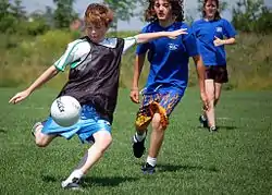 Gaelic football (Irish: Peil Ghaelach; short name Peil[1] or Caid), commonly referred to as football, Gaelic or GAA,[2] is an Irish team sport. It is played between two teams of 15 players on a rectangular grass pitch. The objective of the sport is to score by kicking or punching the ball into the other team's goals (3 points) or between two upright posts above the goals and over a crossbar 2.5 metres (8 ft 2 in) above the ground (1 point).