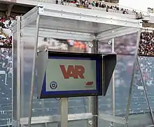 In September 2016, the video review system known as Video Assistant Referees (VAR), was first used in an international friendly between Italy and France. The system was implemented at a FIFA World Cup for the first time at the 2018 FIFA World Cup.[37][19]
