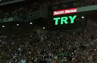 Use of video referee by referees was introduced to rugby union in 2001.[45] The laws of the game allow for "an official who uses technological devices" to be consulted by the referee in decisions relating to scoring a try or a kick at goal.[46] The decision to call on the video referee (now called "Television Match Official (TMO)") is made by the referee following discussion with the assistant referees/touch judges and cannot be instigated by the players or coaches of either team. When concerning an act of foul play, the TMO may alert the referee and initiate the replay process.