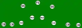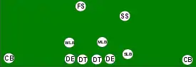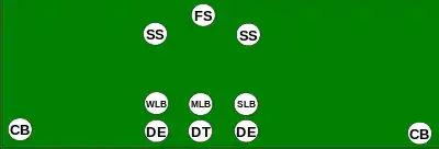 The 3–5–3 refers to a defense that has three down linemen (the "3" level), three linebackers and two corners (the "5" level), one free safety and 2 strong safeties (the "3" level). This is similar to a 33 stack, but with players more spread. Also called the "umbrella" defense or "3-deep". In this set, the third safety would be referred to as a "weak safety" (WS) and allows two position safeties at the mid-level with a third safety deep. It is because of this that the secondary safety in a football defense is called a free safety rather than a weak safety