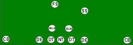 The 5-3 defense consists of five defensive linemen, three linebackers, and three defensive backs (one safety, two corners). It appeared in the early thirties as a response to the improving passing offenses of the time, particularly the T formation.[30][31] It grew in importance as the 1940s progressed, as it was more effective versus the T than the other standard defense of the time, the 6–2. By 1950, five man lines were standard in the NFL, either the 5-3 or the 5-2 Eagle.[32] As late as the early 1950s, the Cleveland Browns were using a 5-3 as their base defense.[33][34]