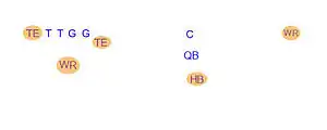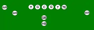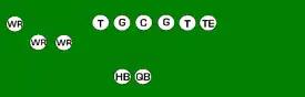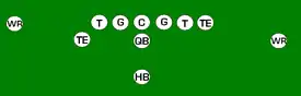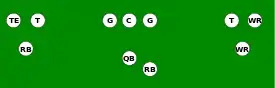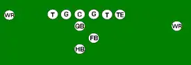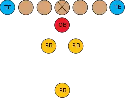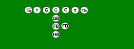 One variation of the T Formation would be where all the running backs would be closer than usual, being at fullback depth rather than halfback depth. Another variation of the "balanced T" formation is the so-called "unbalanced T" formation.[2] In this configuration the line of scrimmage has an end and tackle left of center, while to the right of the center are two guards, a tackle, and an end. This creates a line that is weighted toward the right of the center. With the backfield lining up in the conventional T formation behind the center (quarterback, two halfbacks and fullback), the resulting configuration is "unbalanced" due to the asymmetry of the placement of the linemen. The "split T" spreads the offensive line out over almost twice as much ground compared to the conventional T formation. This causes the defensive line to also spread out, creating gaps the offense can exploit.[3]