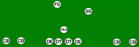 The 33 stack uses an extra strong safety, and "stacks" linebackers and safeties directly behind the defensive linemen.