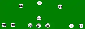 While the original Nickel defense utilized 5 defensive backs in conjunction with a 4-man rush, and 2 linebackers, modern definition calls any formation that utilizes 5 defensive backs (from nickel = 5 cent piece) a Nickel defense. The Nickel defense originated as an innovation of Philadelphia Eagles defensive coach Jerry Williams in 1960 as a measure to defend star tight end Mike Ditka of the Chicago Bears.[43] The Nickel coverage scheme is often used when the offense is using an additional wide receiver as it matches an extra cornerback against the extra receiver. The extra corner is often called a nickelback. Some variations use an extra strong safety instead of an extra cornerback.[44][45][46][47] Strong safeties are often the more physical of the safeties, often resembling linebackers, so a Nickel with the extra safety can be more effective against the run than one with an extra corner. The Nickel formation comes in several varieties: