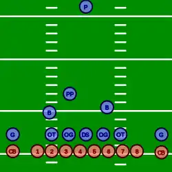 College rules are such that any of the 11 players on the punting team are allowed to proceed downfield at any time once the play has begun (unlike the NFL where only 2 players, the left and right gunners, are allowed to pass the line of scrimmage before the ball has been kicked). This results in many teams employing a "spread punt" or "rugby-style" scheme designed to maximize downfield coverage and limit returners from making larger gains the other way after receiving the ball.