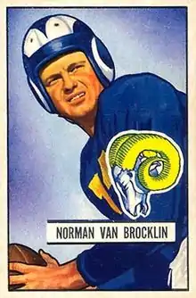 In 1948, halfback Fred Gehrke painted horns on the Rams' helmets, making the first helmet emblem in pro football.[34] Late in 1949, the Dons were folded into the Rams when the All-America Football Conference ceased operations.[35]