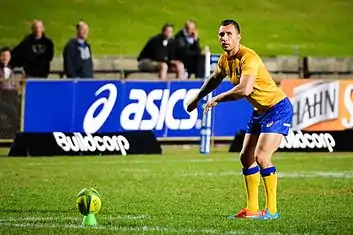 The place kick is commonly used in rugby league for kick offs[2] and most kicks at goal (penalty goals and conversions).[2]