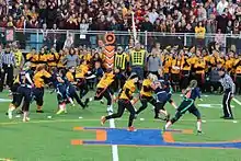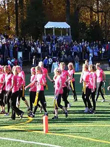 It is not clear when the first powderpuff football game was played, although there is photographic evidence of it being played as early as 1931 at Western State College of Colorado (now Western State Colorado University) in Gunnison, Colorado.[1] One of the first well-documented powderpuff football games was played on October 20, 1945, at Eastern State Teachers College, in Madison, South Dakota.[2] Eastern had cancelled many campus activities for the duration of World War II. Among these were the annual homecoming celebration and intercollegiate sports, including football.[3] With the signing of the peace treaty with Japan on September 2, 1945, and the war’s official end, Homecoming was again on the schedule at Eastern. The traditional football game seemed out of the question, however, due to the wartime military draft. Just three men had enrolled for the fall term that year.[2] "A bunch of us were sitting around after gym class and we thought, if we’re going to have Homecoming, we've got to have a football game," said Susie Lowry, who was a freshman at Eastern in 1945. "We decided we should have a game of our own."[4] Robert C. Nelles, a freshman at Eastern that year, was on the Homecoming committee. The very idea of women playing football "was enough to curl your teeth", he wrote in an account of the game for the History of Lake County, but the committee nonetheless gave its approval for a game with all women players.[2]