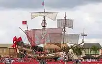 One of the most recognizable features of the stadium is a 103-foot (31 m), 43-ton steel-and-concrete replica pirate ship in the north end zone, making it stand out from other NFL stadiums.[28] Each time the Buccaneers score points, enter the other team's red zone, or win a home game, the replica cannons on the ship are fired off. The cannons fire once for each point scored. In addition, when the Buccaneers enter their opponent's red zone, stadium hosts hoist team flags around the perimeter of the upper deck. During various times throughout the game, the song "Yo Ho (A Pirate's Life for Me)" is played on the stadium public address system (taken from Pirates of the Caribbean), which signals patrons on board the ship to throw beads, T-shirts, and other free prizes to the people below. The segment is also known as a "Mini Gasparilla" to most fans. An animated parrot sits on the stern of the pirate ship. Controlled by radio and remote control, the parrot picks fans out of the crowd and talks to those passing by.[29] The pirate ship's sails, which for NFL games usually shows Buccaneers logos and sponsors, are often changed to suit the event that it hosts.[28]