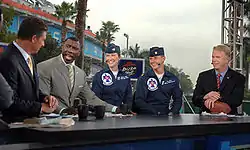 This was the first Super Bowl aired on CBS since the Janet Jackson and Justin Timberlake incident three years earlier, in Super Bowl XXXVIII; and the first since the Viacom/CBS split at the end of 2005. Extensive pre-game coverage, hosted by The NFL Today team of James Brown, Shannon Sharpe, Boomer Esiason and Dan Marino, whose name graces the address of the game site (2269 Dan Marino Boulevard), began at noon (US EST) with NFL Films' "Road to the Super Bowl" year in review (narrated by Tom Selleck). This was followed by "The Phil Simms All-Iron Team", and a four-and-a-half-hour Super Bowl Today pre-game show followed by game coverage at 6:25 PM.[22] Other contributors to the pre-game show included Katie Couric, anchor of the CBS Evening News, Armen Keteyian, CBS News Chief Investigative Correspondent, Randy Cross, who reported from Iraq where U.S. military forces played a touch football game known as "The Baghdad Bowl" and Dick Enberg, who participated in his 12th Super Bowl telecast as a host, play-by-play announcer, or contributor. Westwood One provided radio coverage of the event, with Marv Albert and Boomer Esiason as announcers.[23]