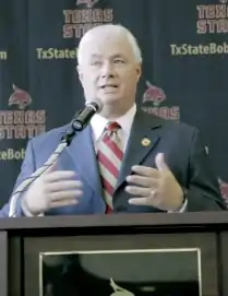 In 2011, the Aggies began as a top 10 ranked team, but fell out of the polls after losing four games, three of which had double-digit half-time leads.[96] Three of those four losses were to teams later ranked among the top ten in the nation. On November 19, 2011, the Aggies defeated Kansas 61–7 and became bowl-eligible for a third straight season.[97] Five days later, on November 24, 2011, they would lose at home to Texas by a score of 27–25 on a last-second field goal,[98] in what would be the last game of the rivalry for the foreseeable future, as the Aggies were to join the SEC beginning in 2012.[99] It was the Aggies' sixth loss of the season, and the fifth in which they held a second-half lead of two or more scores.[96] Sherman was fired by Texas A&M on December 1, 2011.[100] The Aggies compiled a record of 25–25 during Sherman's four-year tenure.[101]
