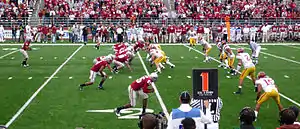 In the fumblerooski, the quarterback takes the snap and immediately places the ball, unseen by the defense, on the ground. This is technically a fumble, and thus the name of the play. The quarterback then moves away from the ball, faking a pass or setting up for a fake hand-off to one side of the line. Meanwhile, one of the backs picks up the ball and starts a rush in the opposite direction. In general terms the play is very similar to the Statue of Liberty, although it gives the quarterback more room for motion. There is some dispute as to whether the fumblerooski is legal.[3]