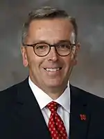 In 1908, Nebraska was inducted as a member of the Association of American Universities, an organization of research universities.[24] In recent years, Nebraska ranked near the bottom of the AAU's statistical criteria for members, a ranking attributed in part to the university's extensive agricultural research funded by the U.S. Department of Agriculture, which is not included in the AAU's rankings because it is not awarded by peer-reviewed grants; and because Nebraska's medical school is a separate institution whose research funding is not under UNL's auspices. Nebraska successfully retained its AAU membership after a 2000 challenge, which provided the school with an advantage when the Big Ten was looking to expand in 2010, as all of its members at that time were AAU members. Nebraska Chancellor Harvey Perlman stated "I doubt that our application would've been accepted had we not been a member of the [AAU]."[25] However, in 2011, after an extended campaign to retain its membership and a close, contentious vote, Nebraska became the only institution to be removed from the AAU membership by a vote of the membership (a few other institutions had voluntarily resigned.)[26][27][28][29]
